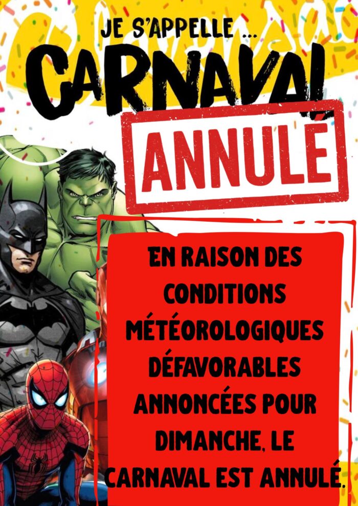 Nous vous informons qu’en raison des conditions météorologiques défavorables annoncées pour dimanche, le carnaval est malheureusement annulé.