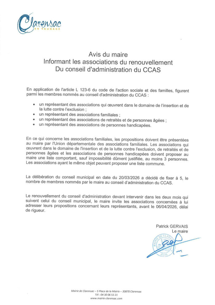 https://clarensac.fr/actualites/avis-du-maire-informant-les-associations-du-renouvellement-du-conseil-dadministration-du-ccas/