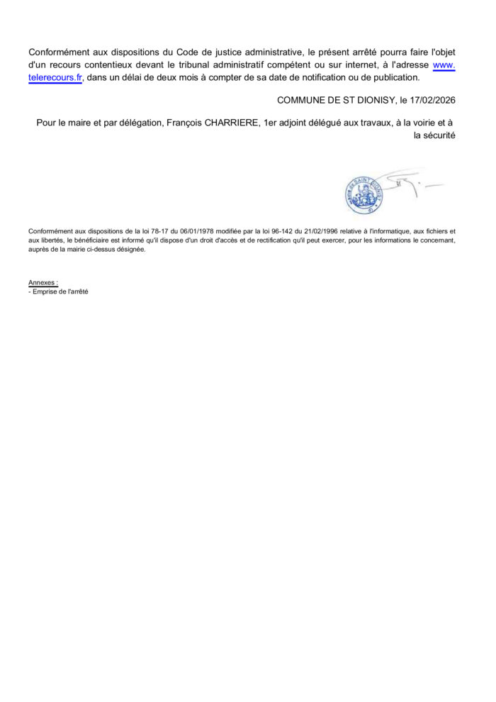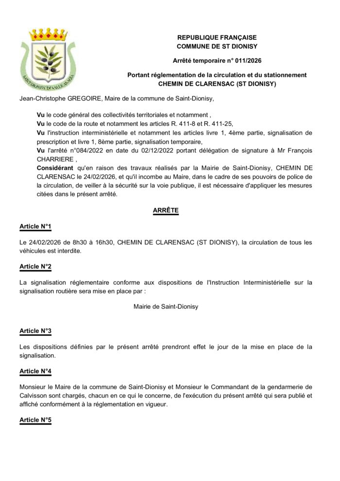 Le 24/02/2026 de 8h30 à 16h30, CHEMIN DE CLARENSAC (ST DIONISY), la circulation de tous les véhicules est interdite.