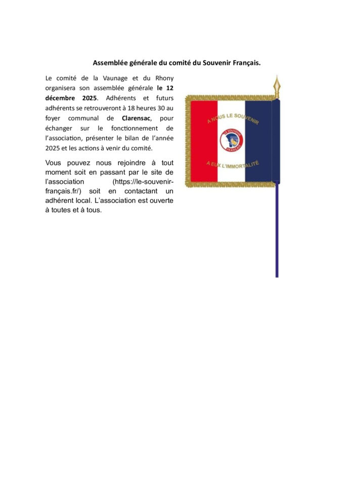 https://clarensac.fr/actualites/le-comite-de-la-vaunage-et-du-rhony-du-souvenir-francais-organise-son-assemblee-generale-annuelle-le-12-decembre-prochain-a-18h30/