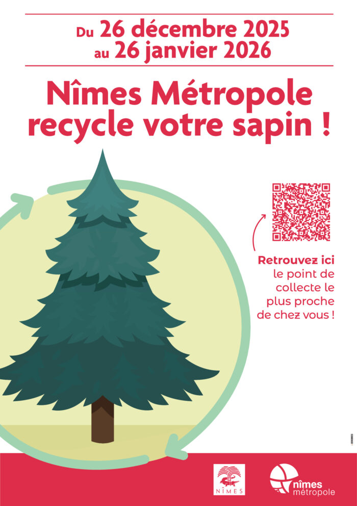 Nîmes Métropole, en partenariat avec la Ville de Nîmes et les communes participantes — Bernis, Bezouce, Bouillargues, Caissargues, Caveirac, Clarensac, Fons-outre-Gardon, Domessargues, Gajan, Garons, Générac, La Calmette, Langlade, Lédenon, Manduel, Marguerittes, Milhaud, Montignargues, Moulézan, Nîmes, Poulx, Redessan, Saint-Bauzély, Saint-Côme-et-Maruéjols, Saint-Gilles, Sainte-Anastasie et Sauzet — vous invitent à déposer votre sapin dans l’un des 96 “Parcs à sapins”, accessibles 7j/7 et 24h/24.