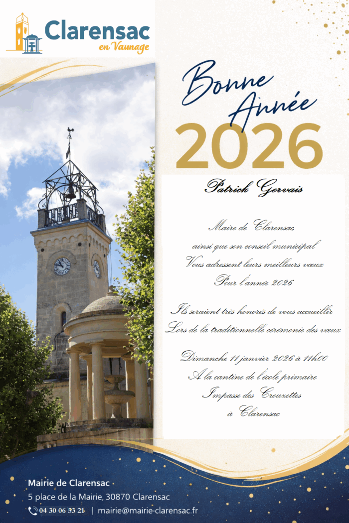 Monsieur Patrick GERVAIS, Maire de Clarensac, et le Conseil municipal ont le plaisir de vous inviter à partager un moment convivial lors de la cérémonie des vœux 2026, qui aura lieu le :