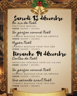 Cette année les Santa Fééries changent de formule pour un festival de spectacle réalisé par les chanteurs, les acteurs, les danseurs et les musiciens. À l’affiche 5 spectacles différents : comédie musicale, contes lus et joués et spectacle instrumental, le tout sur le thème de Noël.