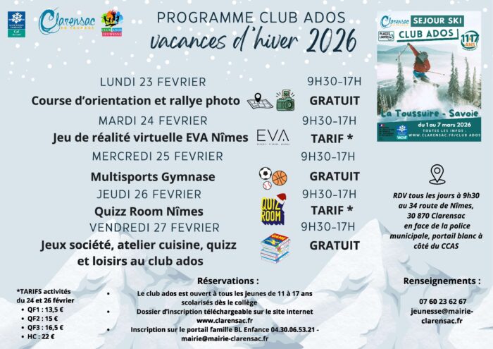 Les inscriptions pour le séjour SKI du Club Ados sont officiellement ouvertes ! ❄️🎿 Rejoins nous pour une semaine de glisse, d'aventures et de souvenirs. Les places sont limitées : n'attends pas pour réserver ta participation 🔥. Toutes les infos et le formulaire d'inscription sont disponibles ci-dessous :